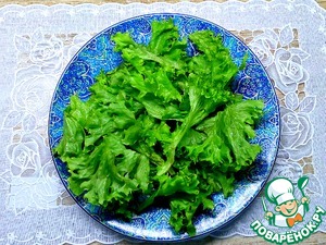 Листья салата вымыть, стряхнуть воду, порвать руками на тарелку.