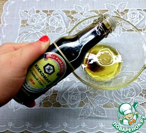 Смешать в пиале оливковое масло, горчицу и соевый соус.