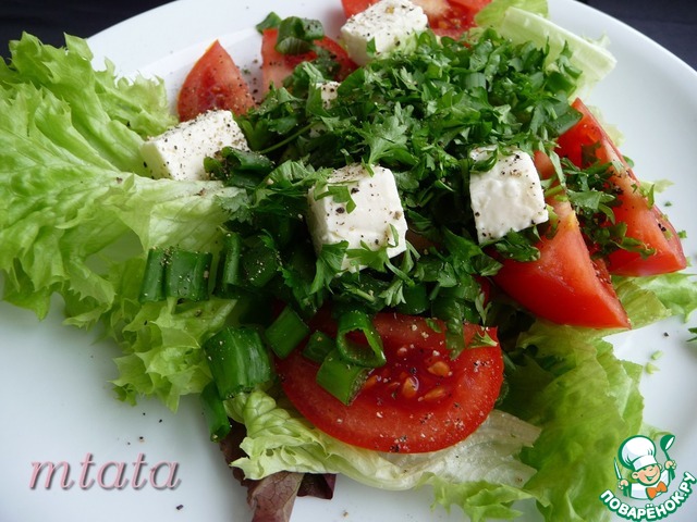Брынзу порезать кубиками, выложить на салат. Вместо брынзы можно использовать адыгейский сыр или моцареллу.