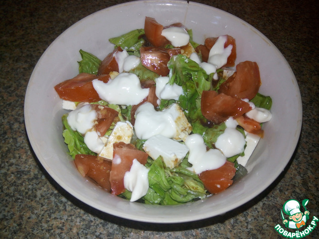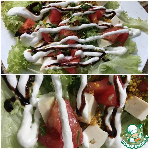 Зелень вымыть, стряхнуть воду, мелко порубить и выложить на помидоры. Полить сверху заправкой. Не перемешивать. Украсить сметаной и бальзамиком.