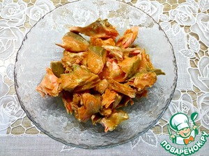 Рыбу, в моем случае горбуша (можно использовать семгу, форель, кету, нерку), отварить в слабо кипящей воде 7-10 минут с добавлением пары долек лимона и перца горошком. Рыбу немного остудить, снять кожу, удалить кости.