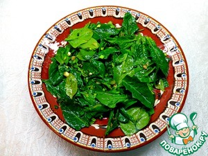Шпинат и зеленый лук вымыть. Лук мелко порубить, листья шпината оставить целиком. Смешать листья шпината и лук, выложить на блюдо, полить заправкой 2.