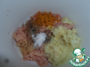 В фарш добавляем специи, соль, чеснок и лук пропущенные через мясорубку. Хорошо перемешиваем.