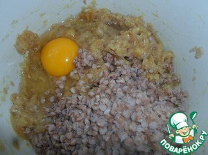 Затем добавляем яйцо и отварную гречневую крупу. Снова перемешиваем.