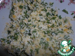 Делаем начинку. Сыр и яйца трем на средней терке, зелень мелко рубим. Вилкой вымешиваем до образования однородной массы.