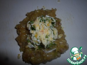 Берем фарш расплющиваем его на ладони. В середину кладем начинку. На начинку кладем еще немного фарша.