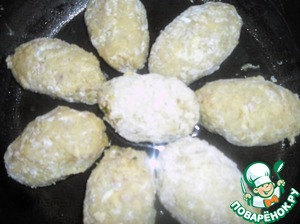 Формируем котлету, обваливаем ее в муке. Так делаем со всем фаршем и начинкой.