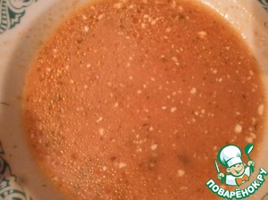 Готовим соус. Томатную пасту смешать со сметаной в однородную массу. Добавить воду, зелень и соль и опять в однородную массу. По желанию добавить растительное масло.