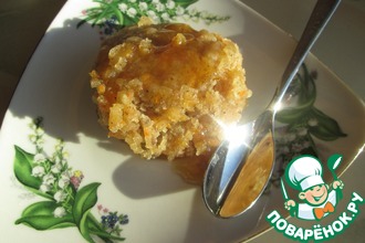 Кекс готов! Кладем его на тарелку, предварительно в тарелку наливаем сироп, у меня клубничный, и сам кекс щедро поливаем сиропом.