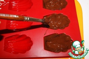 Растопить шоколад на паровой бане или СВЧ. Нанести тонким слоем на всю поверхность силиконовой формы. Поставить в холодильник. Нанести еще один тонкий слой шоколада и опять поставить на 5 минут в холодильник. -