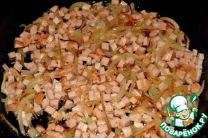 Добавляем ветчину к луку и ещё пару минут обжариваем, помешивая.