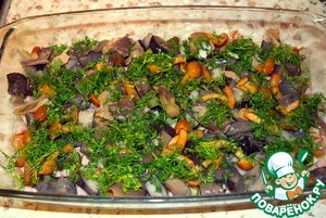 С маринованных грибов частично слить жидкость, примерно пару столовых ложек маринада я оставляю, для сочности. Грибы можно немного измельчить, мелкие добавляю целиком.. Выкладываем следующим слоем.