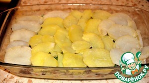 Форму для запекания смазываем сливочным маслом, берём половину картофеля и выкладываем слой, на дно формы по типу "рыбьей чешуи"))