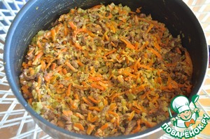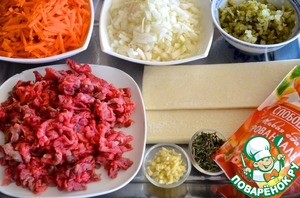 1. Говядину и морковь порезать тонкой соломкой, луковицу и соленые огурцы – мелкими кубиками. Чеснок мелко порубить.