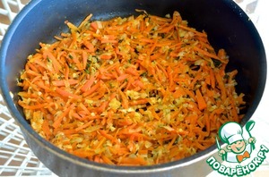 2. Лук потушить в оливковом масле до прозрачности. Добавить морковь, готовить помешивая на среднем огне 7 минут, всыпать листья тимьяна и добавить пол-стакана воды. Убрать огонь до минимума и тушить до мягкости моркови 15 минут.