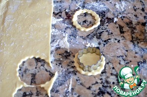 5. Плиту разогреть до 200С. Слоеное тесто раскатать толщиной 3 мм. Вырезать кружки теста с помощью формы диаметром 3 см. Половину кружков выложить на противень.