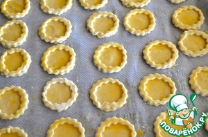 7. Смазать кружки теста взбитым яйцом, сверху положить ободки, чуть прижать и тоже смазать яйцом. Запекать 15 минут, чтобы «чашечки» поднялись и стали румяными.