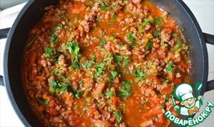 2. Помидоры порезать на кубики и добавить в сковороду к фаршу. Всыпать рубленную петрушку, поперчить и посолить по вкусу и готовить 20 минут, помешивая, до выпаривания лишней жидкости.