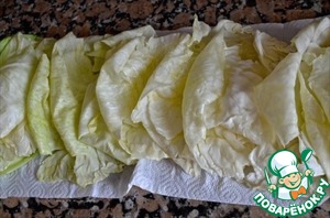 3. У капусты вырезать кочерыжку. Сам кочан отварить до полуготовности и разобрать на листья. У листьев вырезать жесткую часть возле основания.