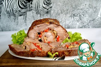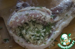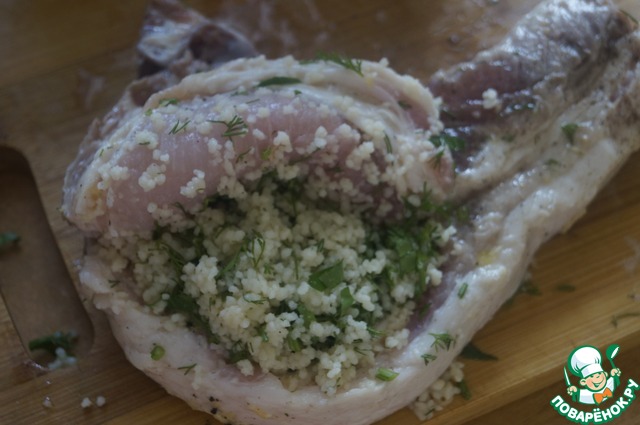 Очень эффектное и вкусное блюдо, которое отлично будет смотреться на праздничном столе. Готовится очень легко. Мясо получается вкусным и нежным, а начинка из кус-куса приобретает потрясающий аромат и вкус.