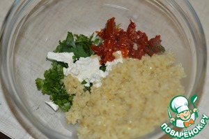 3. В чашке смешать сыр, нарезанные томаты, зелень, булгур.
