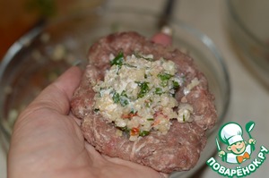 4. Из фарша сделать лепешку, в середину выложить начинку из булгура, сформировать "котлеты".