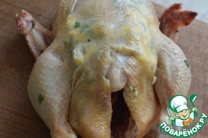 Мягкое сливочное масло смешать с зеленью, поместить масло под кожу на грудку цыпленка.