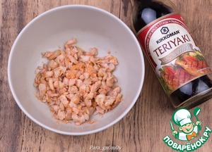 1. Отварить и очистить креветки. У меня было несколько креветок с икрой, я ее тоже добавила. Креветки мелко нарезать. Слегка сбрызнуть лимонным соком. Добавить соевый соус и перемешать.