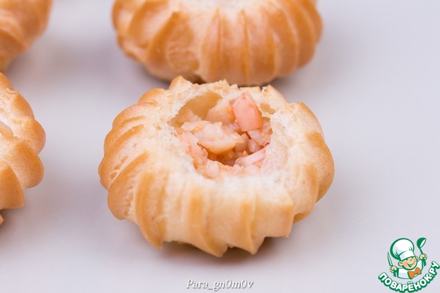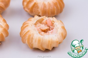 3. У профитролей срезать крышечки и положить внутрь по пол-чайной ложки нарезанных креветок.