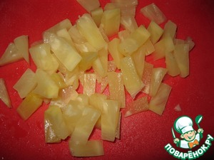 Ананас также разрезать на мелкие кусочки.