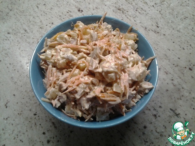 Курицу и ананас смешать в салатнике, добавить корейскую морковку и майонез. Все хорошо перемешать. Все очень быстро и вкусно. Приятного аппетита.