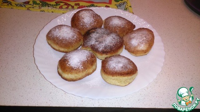 Итак, наливаем в сковородку побольше растительного масла и жарим наши пончики с двух сторон до румяной корочки! Раскладываем на блюдо, можно посыпать сахарной пудрой, покушать с медом, сметаной, как вам нравится. Вкус у пончиков творожный несмотря на то, что в их составе нет творога, а есть плавленные сырки, но сыра не чувствуется.