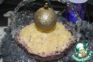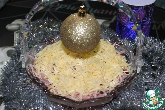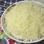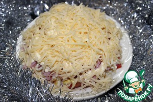 Хорошо смазываем майонезом (этот шаг я забыла сфотографировать) Трем сыр на мелкой терке и украшаем наш салат.