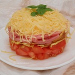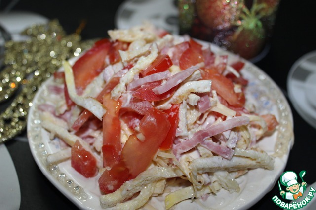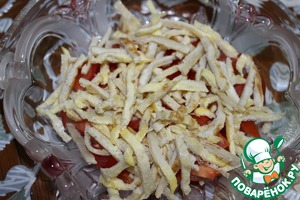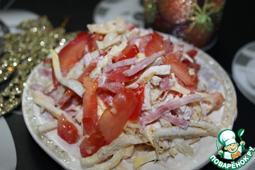 Поджаренные яйца режем тоже тонкими полосочками и укладываем на наше блюдо. Сверху выкладываем ветчину, тоже нарезанную тонкими полосочками.