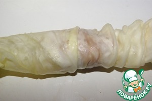 Разобрать кочан на листья, срезая утолщения и разрезая их пополам, если листья крупные. Я срезаю под углом...
