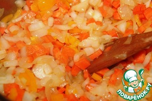 Добавить морковь и перец тушить все вместе еще 3-4 минуты. -