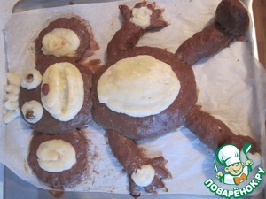 Оформляем обезьяну картофельным пюре. В глаза вставляем грибы. Запекаем в духовке при 200* 15 мин. Вставляем язык из моркови.