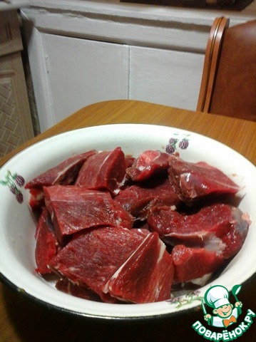 • Обрезать с мяса жир, мясо нарезать большими кусками.