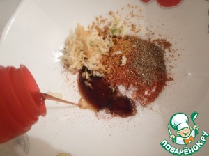 Смешиваем, чеснок, паприку, кориандр, куркуму, соль и соевый соус.