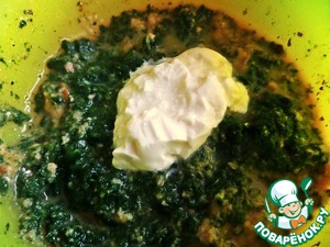 Шпинат взбиваем с яйцом и сметаной.
