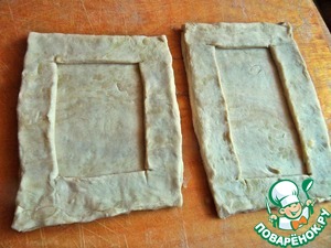 Две части послужат основой, из двух вырезаем оконца. Приклеиваем их взбитым яйцом к основе.