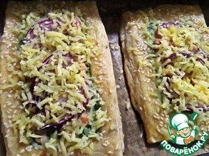 Ставим в духовку на 180*, немного запекаем, потом вынимаем, присыпаем тёртым сыром и отправляем допекаться до румяной корочки.