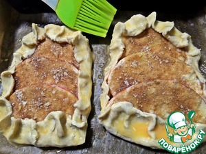 А теперь, как обещала, из остатков теста будем делать яблочные слоечки. Раскатать прямоугольники и выложить дольки яблока, смазать сметаной.