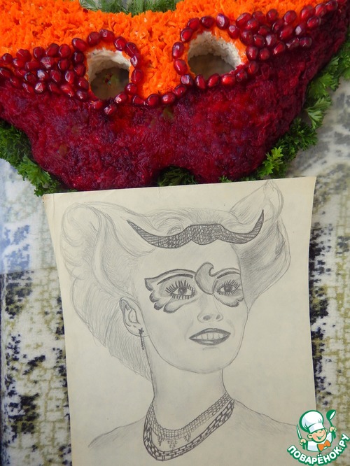 Иногда, под Новый Год что-то возвращается из прошлого!, Вчера я увидела в Контакте фотографию этого салата и вспомнила, что я очень давно готовила его! Не поленилась порыться в старых бумагах и нашла лекало по которому выкладывала салат, а также свои старые рисунки! И сразу захотелось пересмотреть фильм "Летучая мышь".. и вспомнились слова романса"Все шепчут: "Маска, я вас знаю"! Глаза в глаза."... Пусть каждый, кто увидит перед собой маску, обнаружит под ней только любящие глаза!! С наступающим!!!