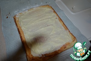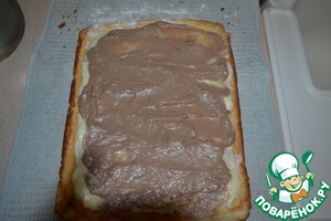 Аккуратно сверните в рулет, дайте полежать в таком состоянии минут 5, чтобы корж принял форму.