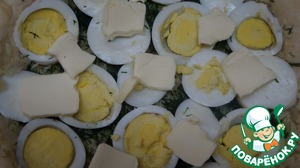 Затем выкладываю яйца, а сверху - кусочки сливочного масла.