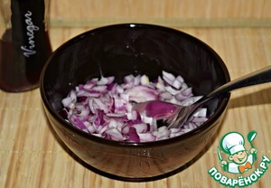 Лук мелко порезать, залить уксусом и оставить мариноваться на 30 минут.