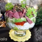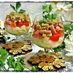 Как вариант, можно слоями салат не выкладывать, а просто перемешать все ингредиенты.