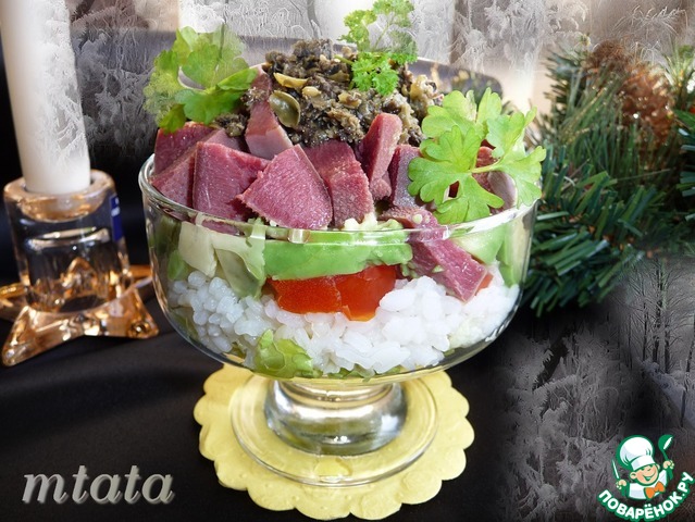 В бокалы или салатник разложить салат слоями:салатные листья (порвать руками), рис, помидоры, авокадо и язык.