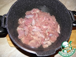 Мясо промыть, очистить от лишнего жира, нарезать кусочками, залить 4-мя стаканами воды, поставить на огонь.